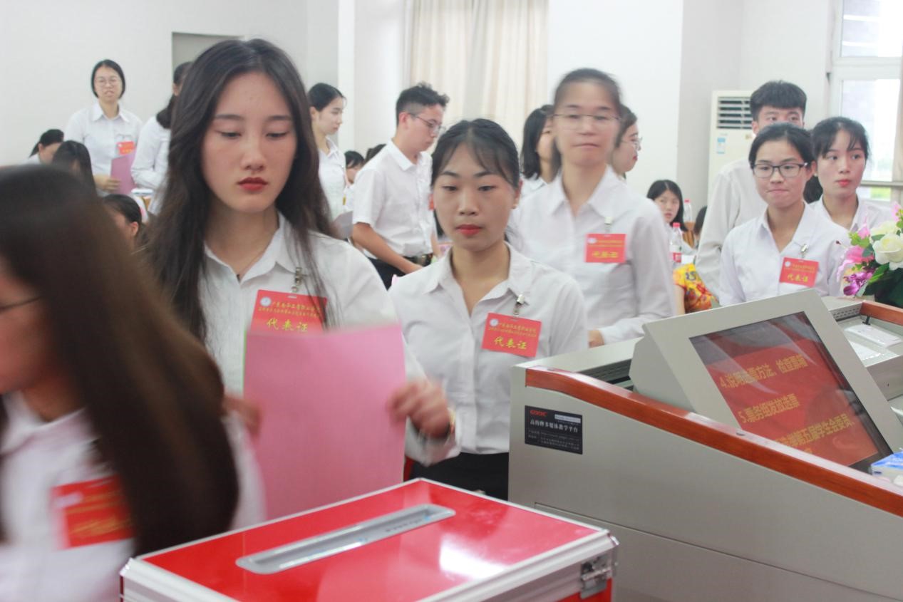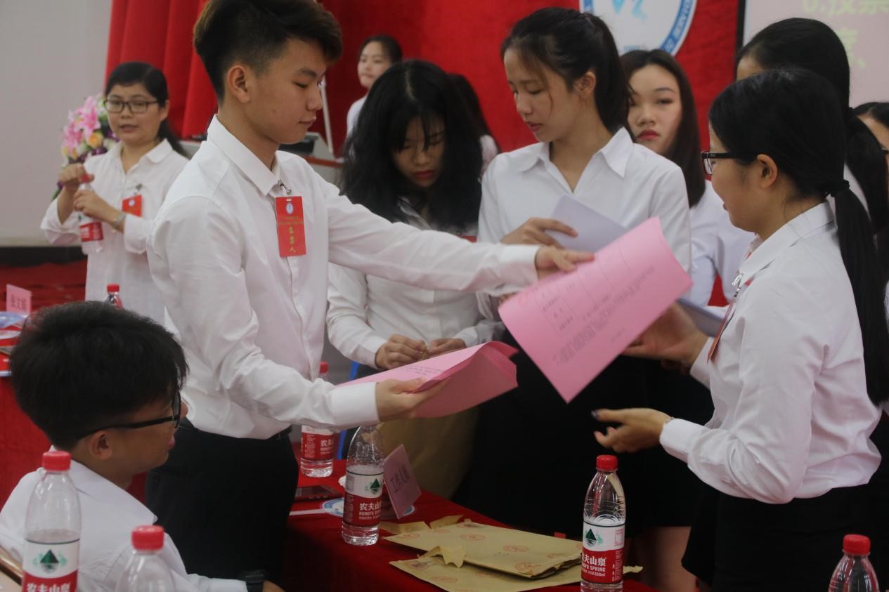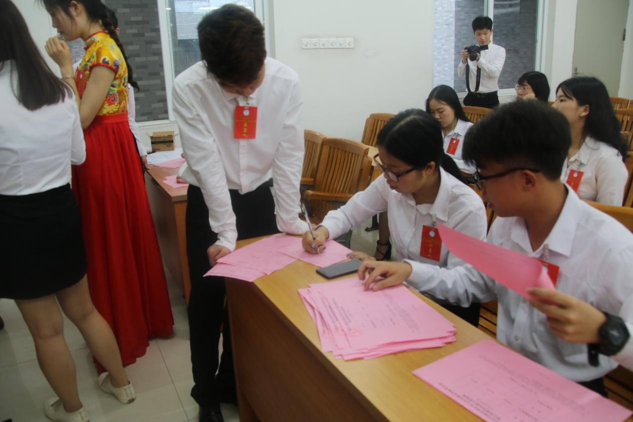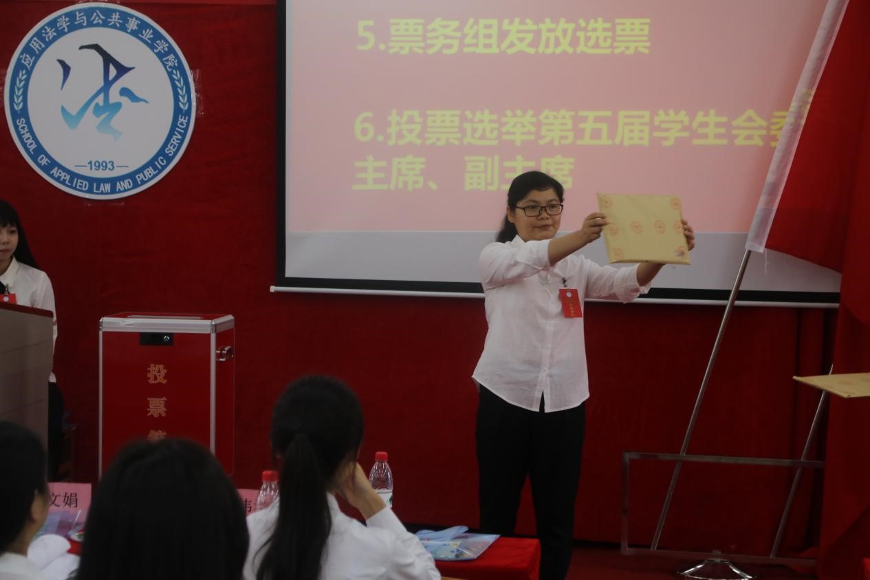 委员演讲完毕后,开始正式选举第五届学生会委员,由总监票人法公学院团总支书记张文娟老师宣读代表出席大会情况,并公示检查选票的密封情况,由监票人和计票人向代表公示票箱并发放选票。