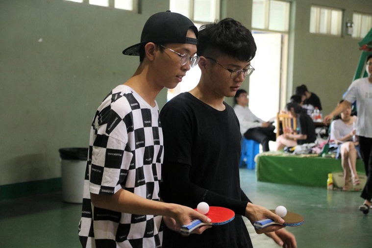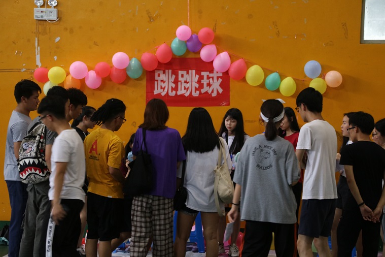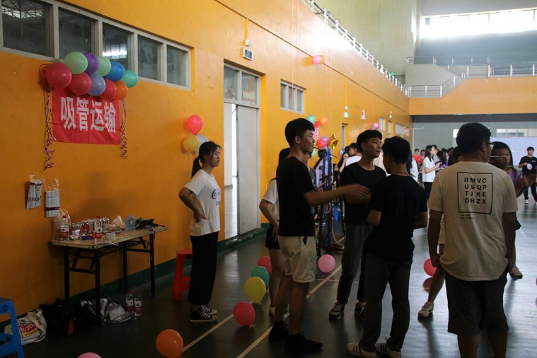 活动还没开始时体育馆门口已是人山人海了,但随着比赛开始的一声令下,同学们便踊跃地走到游戏区进行游戏比赛。第一个游戏区为:吸管运输。这个游戏是考验团队小伙伴们的配合度,需要每人嘴里叼一支吸管,在吸管上放一个钥匙环,在不用手接触吸管和钥匙环的情况下,只用嘴叼吸管的姿势,把钥匙环往下传到最后一个人。这游戏看起来很难,但是每一个队伍通过完美配合都顺利完成。