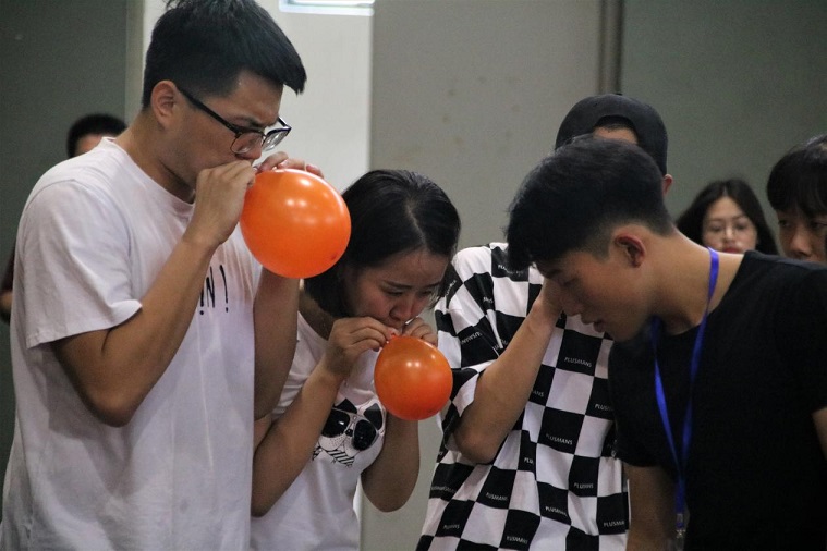 第七个游戏区为:合力吹气球。主持人请每组成员每人抽签首先,抽到嘴巴,手,脚的同学站一边,抽到坐气球的同学站在距离指定位置的地方,抽到嘴巴的同学必须借着抽到一只手的两个同学帮助把气球吹起,吹完由抽到脚的同学抬到抽到坐气球的同学那由他把气球坐破。