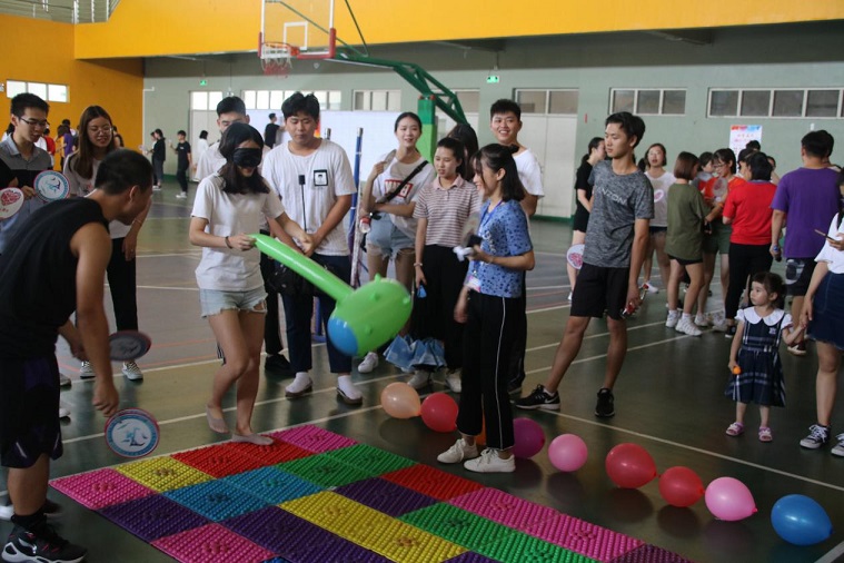 第四个游戏区为:穿拖鞋。每队参赛者在蒙上眼睛转两圈,在队友的指引下走七步路,成功穿上拖鞋算赢。这个游戏考验的是队伍里成员之间的信任度,在队友的正确指引下,每个队伍都出色地完成了任务。