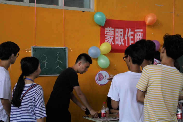第五个游戏区为:爆竹声响瞎子吃饼。每组派两个成员吹气球,一名成员吃饼,其他三名同学当引导者,当主持人喊“开始”时吹气球同学开始依次吹爆气球,在气球吹爆后,吃饼同学开始带上眼罩,原地转四圈后开始由队友引导向前找到饼,打开包装,完整吃完整个饼算完成。这个“蜿蜒曲折”的游戏引得全场气氛紧张而又刺激,在场外观看的每个人都跃跃欲试,非常兴奋。