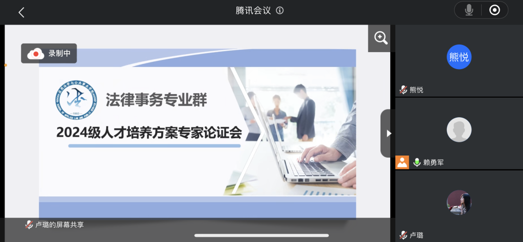 为进一步提高人才培养的质量,应用法学与公共事业学院于2024年3月8日20:00-22:00通过腾讯会议线上召开2024级法律事务专业群人才培养方案专家论证会。本次会议由校外专家、教师代表和学⽣代表共同参与。出席会议的专家有:广东金宏桥律师事务所主任赵善启、中创慧文科技股份有限公司总经理郭向阳、上海踏瑞科技有限公司华南区域经理林嘉鑫及广州崇正私募证券投资基金管理有限公司总监王艳。会议由系主任赖勇军主持,教学工作负责人兼现代文秘专业负责人卢璐、人力资源管理专业负责人范劲鸿、法律事务专业负责人罗丽珍、行政管理专业负责人吴璟杲、教务秘书熊悦以及21、22级学生代表参加此次会议。