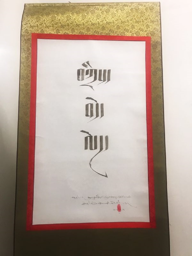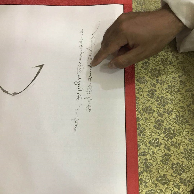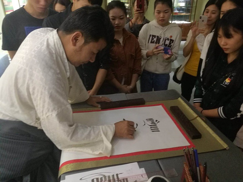 在参观即将结束的时候,我院赖云朋同学(曾被评为广东省优秀团员)对拉欧达布大师表示,南华即将迎来校庆25年,请大师能否题字给予祝福。拉欧达布大师听说后,非常开心,欣然答应,当场用藏文题字——扎西德勒,表达对9999js金沙老品牌全体师生的美好祝愿。
