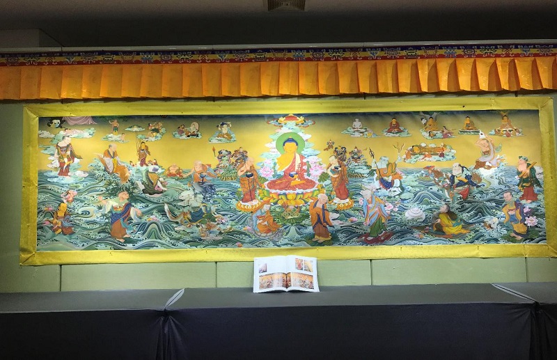 拉欧达布,是西藏职业唐卡画师,他的画作采用齐岗画派风格,如今技艺几近失传,此次他带来了不少唐卡作品。参观期间,拉欧达布大师详细给我们讲解了唐卡的来历、制作,唐卡是藏族文化中一种独具特色的绘画艺术形式,指用彩缎装裱后悬挂供奉的宗教卷轴画,传统唐卡的绘制要求严苛、程序极为复杂,必须按照经书中的仪轨及上师的要求进行,包括绘前仪式、制作画布、构图起稿、着色染色、勾线定型、铺金描银、开眼、缝裱开光等一整套工艺程序。制作一幅唐卡用时较长,短则半年完成,长则需要十余年。