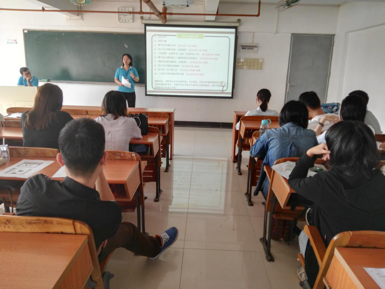 10月10日上午,在天河校区举行了2014级社会工作专业学生实习动员大会。出席的有蔡红老师、兴华街团工委张海燕、兴华街家庭综合服务中心社工林惠玲、廖忠武。动员会首先由蔡红老师宣布了实习分组名单,分配了每个小组的督导老师。蔡红老师勉励大家,把本次实习当作一次模拟工作演练,不要怕路途远,不要怕艰苦,要敢于承担。