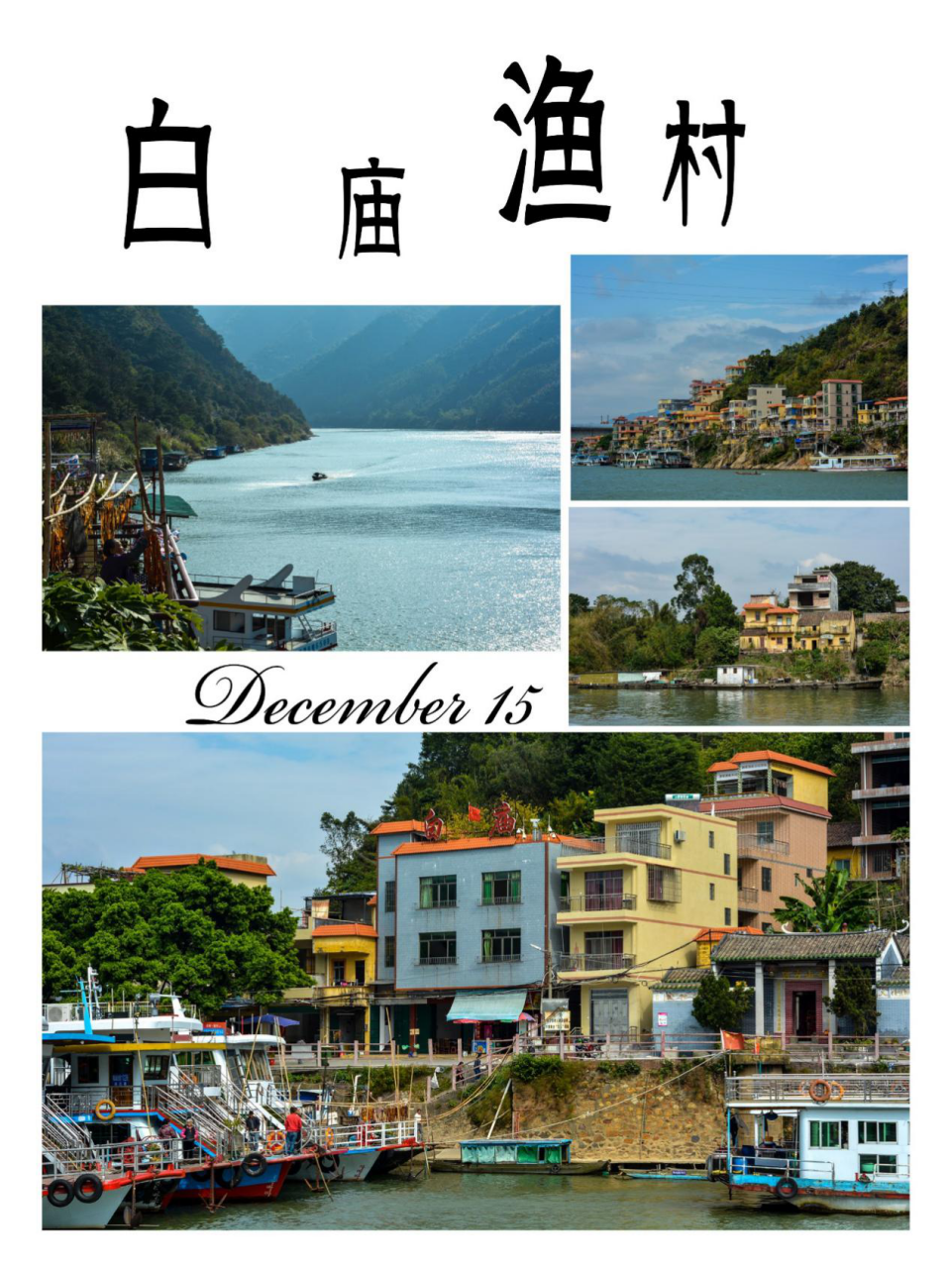 在社区服务课堂上,刘老师就向我们介绍了白庙渔村的大致情况:白庙渔村是一个别具水乡特色的好地方,位于清远市北江上游,村内渔民民风淳朴,区域地势低平,水域面积较广,气候温暖,植被覆盖良好,环境安逸而幽静,具有丰富的水产资源,是飞霞风景名胜区的西入口飞来峡上的一颗明珠。