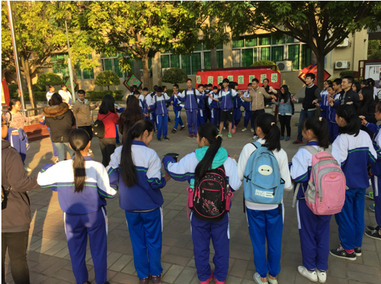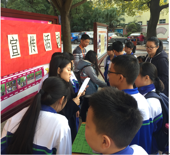 活动以问答形式开展,我们的摊位刚设置好,就陆续有学生过来参与,由于摊位前聚集学生较多,现场有些混乱,于是我们运用在课堂上学到的知识来应对,在操场的空地上引导学生围成一个圈,为他们开展一个团体游戏——“阿水的故事”,使得活动不那么枯燥地问答题目的同时,也增加了许多乐趣,同时也分流了人群,维护现场秩序。这个游戏结束后,顺势另辟一个活动点开展了法律知识抢答活动,最大限度地使同学们都参与到普法活动中。