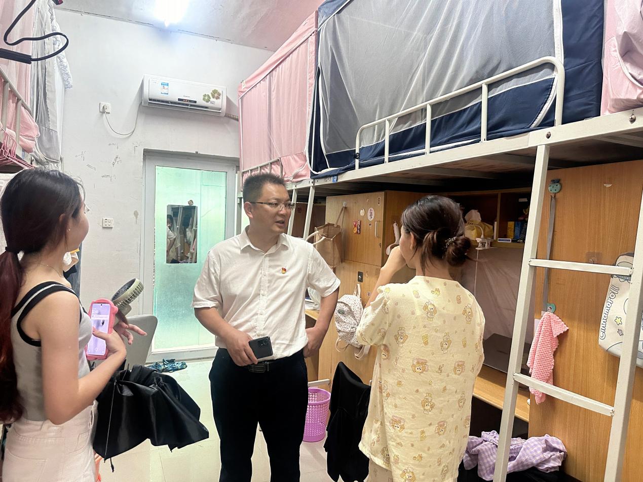走访过程中,刘喜民书记与张弋副院长逐间走进学生宿舍,与同学们亲切交谈,详细询问大家的住宿体验、学习进度及生活中遇到的困难。结合当前季节特点与安全工作要求,学院领导同步向同学们传达了两项重点工作任务:一是全面开展宿舍卫生大扫除行动,清理卫生死角,规范物品摆放,同时由各班辅导员牵头统计学生蚊帐安装情况,对于尚未安装的同学,学院将协调资源提供必要帮助,从源头减少蚊虫滋生,保障同学们的休息质量与身体健康;二是扎实做好台风防御准备工作,为应对近期台风“桦加沙”所带来的强对流天气,要求同学们提高安全防范意识,提前检查宿舍门窗密封性,及时收回阳台外悬挂的衣物、脸盆等易坠物品,密切关注学校及学院发布的预警通知,严格遵守应急管理规定,遇有突发情况第一时间向辅导员报告,确保自身生命财产安全。
