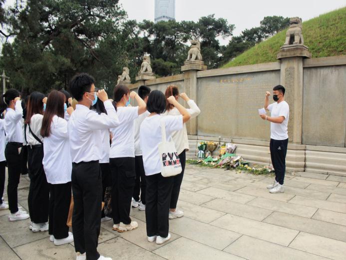 紧接着,江帆老师带领全体师生肃立默哀、瞻仰烈士陵墓、敬献献花,表达对革命烈士的崇高敬意和深切的缅怀之情。敬献鲜花后,20级学生干部李志轩同学带领大家重温入团誓词,让红色基因融入血脉,时刻牢记“党建带团建,永远跟党走”的初心和使命。