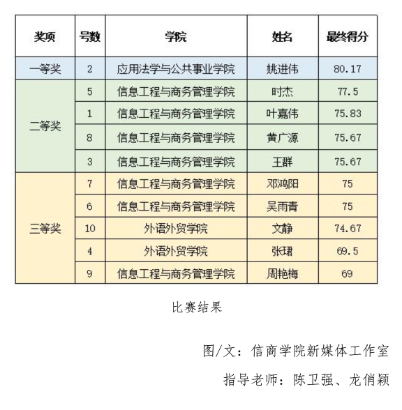 评分改为录播评分。2021年6月2日晚上7点在教学楼101进行决赛录播。视频录制期间,参赛选手候场、工作人员需佩戴口罩。比赛现场的全过程由信息工程与商务管理学院新媒体运营中心技术组的同学全程录制视频。本次主持人比赛的环节有妙语连珠、指点江山、主持风采、才艺表演,总分为100分。选手们的主持功底扎实,语言流畅,气质不凡,充分展现了参赛选手们自己的语言组织能力和逻辑思维能力,凭借着自己的文学功底冷静应对第一环节妙语连珠;虽然参赛选手们都不是专业的主持人,可是他们的理解能力和现场应变能力却毫不逊色,在第二环节指点江山环节中,直击主题,体现了一个主持人应该有的主持功底;第三环节是主持风采,比赛已经进入白热化阶段,参赛选手的状态和激情表现到极致,将自己抽到的主题进行主持,选手们提前准备了影片、音乐,表现十分出色;在才艺环节中,参赛选手们多才多艺,不仅仅能歌能舞,还会配音、茶艺、单口相声等才艺表演。因疫情影响,现场决赛改成了线下录制视频,但是选手们的激情和活力依然不减。
