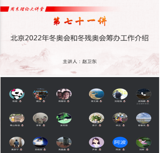 按照 “ 每周一学 ” 学习计划安排 , 同时根据教育部社科司 “ 周末理 论大讲堂 ” 的学习安排 , 11 月 5 日下午 , 马克思主义学院组织开展党 史、业务双学习活动。 马克主义学院全体教师首先共同观看了 2 021 年秋季学期全国 思想政治理论课教师 “ 周末理论大讲堂 ” 第七十一讲的直播。 北京市 委宣传部常务副部长 赵卫东作了题为 “ 北京 2022 年冬奥会和冬残奥 会筹办工作介绍 ” 的报告 。 赵卫东副部长从 办好北京冬奥会 、 冬残奥 会 的重大意义出发,给大家分享了北京冬奥组委全面落实绿色、共 享、开放、廉洁办奥理念,以及稳步有序推进的各项筹办任务。尤 其结合全球新冠肺炎疫情持续蔓延所带来的挑战,重点介绍了《北 京 2022 年冬奥会和冬残奥会防疫手册 》 , 通过严格执行防疫政策把 好关口,确保冬奥会安全举办。赵卫东副部长的报告,让大家充分 感受到中国对世界作出的 “ 办好北京冬奥会、冬残奥会 ” 的庄严承诺 一定会实现, 为世界奉献一届精彩、非凡、卓越的奥运盛会。 在党史学习中,学院党支部组织委员谭靖仪同志领学了习近平 总书记重要文章《坚定理想信念补足精神之钙》及《中国共产党组 织建设一百年》第一、二章。与会同志认为,习总书记的文章 思想 深刻、内涵丰富,情理交融、语重心长,饱含着对全体党员的谆谆 教诲和深切期望 。 今天,像战争年代那种血与火的生死考验少了,但具有新的历史特点的伟大斗争仍然在继续,我们正面临着一系列 重大挑战、重大风险、重大阻力、重大矛盾的艰巨考验 ,我们仍要 以赶考之志奋进新征程,深刻感悟百年来党的理想信念穿越时空的 强大力量,进一步增强斗志、坚定信心,在全面建设社会主义现代 化国家新征程上披荆斩棘、奋力前行 。