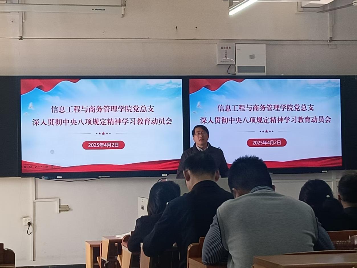 4月2日,信息工程与商务管理学院(以下简称“信商学院”)党总支部召开深入贯彻中央八项规定精神学习教育动员部署会,集中学习《习近平关于加强党的作风建设论述摘编》,传达学习中共中央办公厅《关于在全党开展深入贯彻中央八项规定精神学习教育的通知》精神。学院党总支书记郑海清作动员讲话,全体师生党员参加会议。