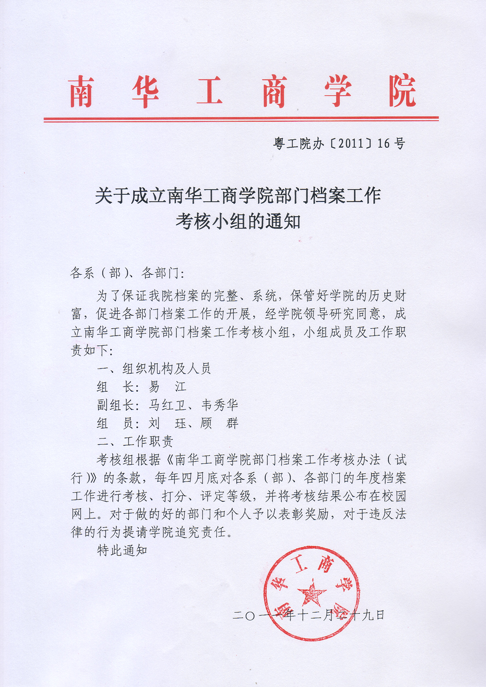 关于成立南华工商学院部门档案工作考核小组的通知