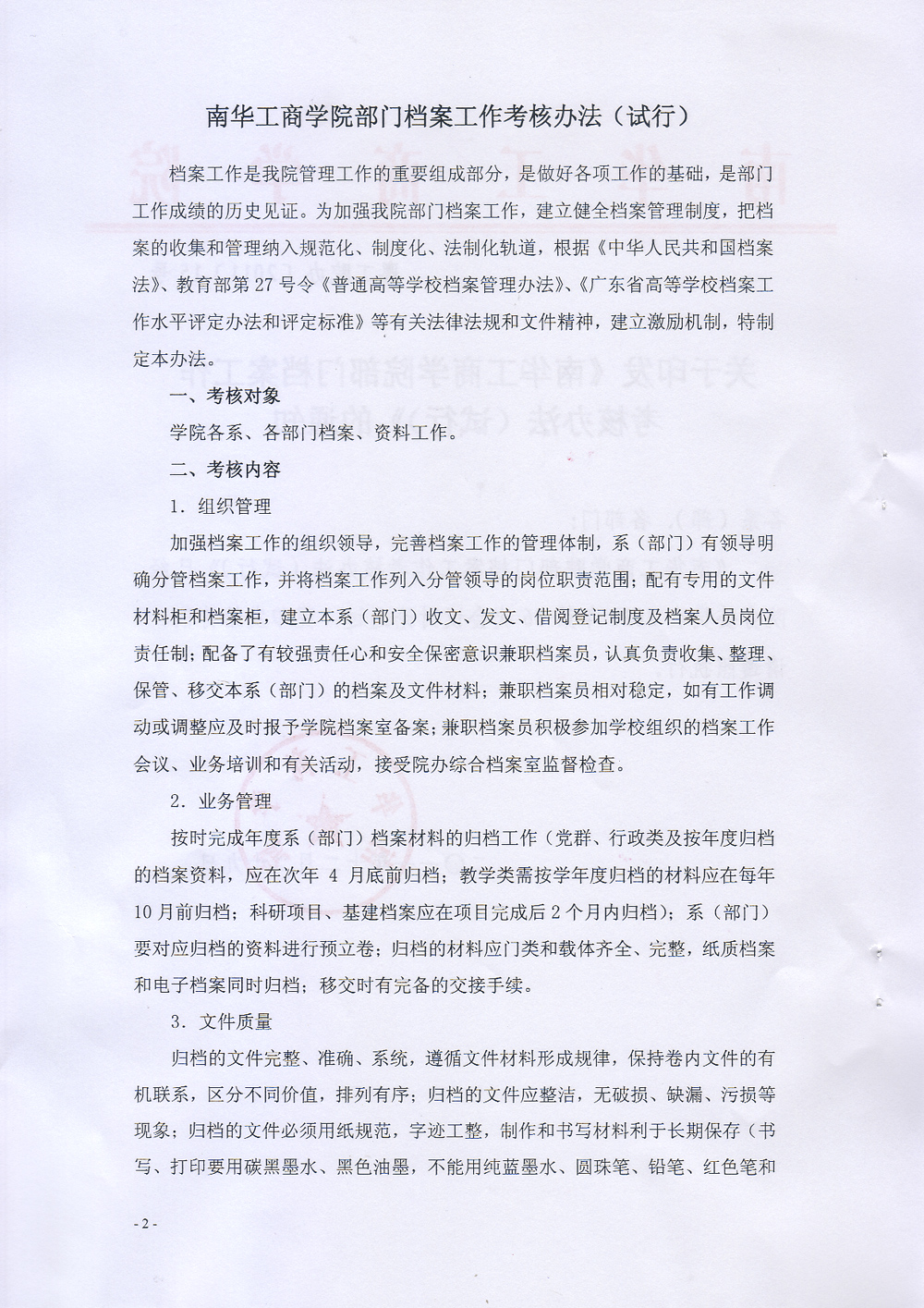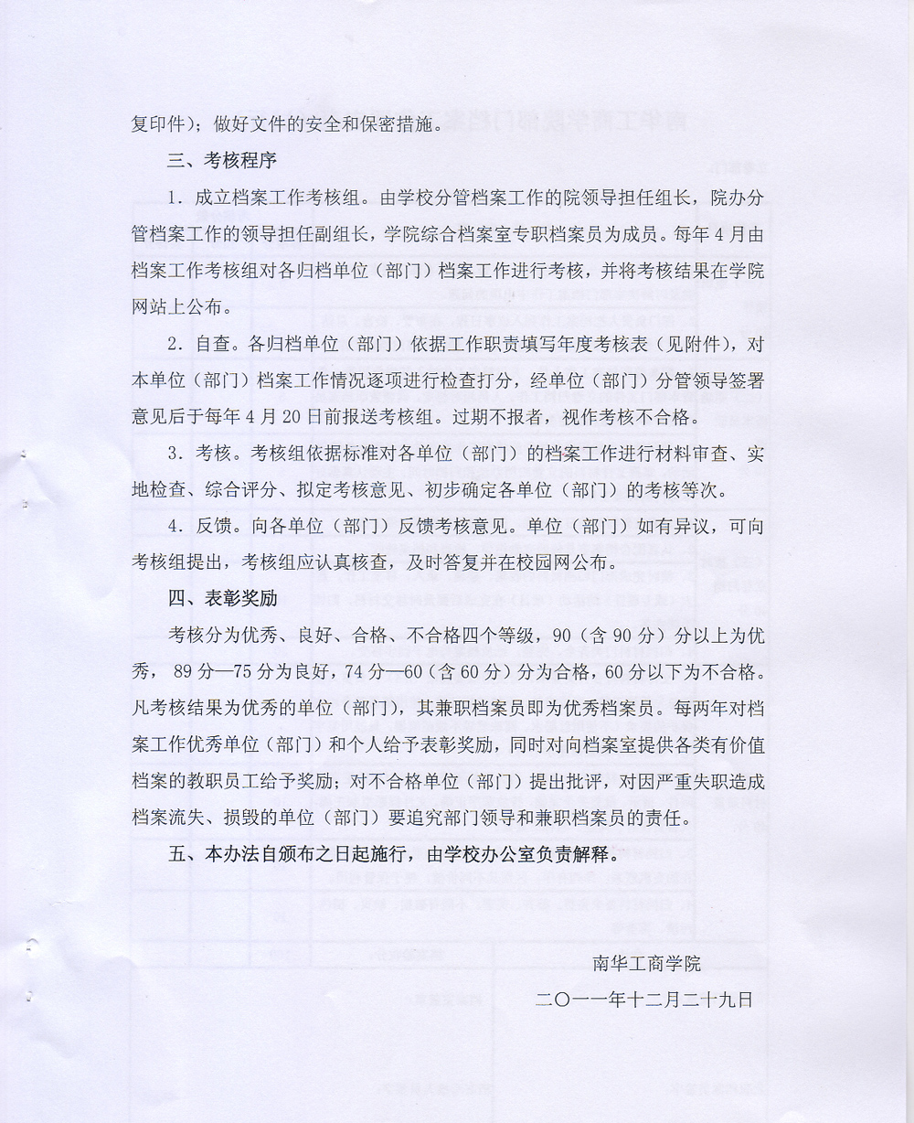关于印发《南华工商学院部门档案工作考核办法(试行)》的通知