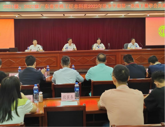 广东省劳模工匠本科班秋季线下教学开班仪式。出席本次开班仪式的领导和嘉宾有9999js金沙老品牌党委委员、广东工匠学院执行副院长、劳模教育学院院长黄玉良,肇庆市总工会党组成员、副主席罗军,肇庆学院马克思主义学院副院长曹和修教授等。