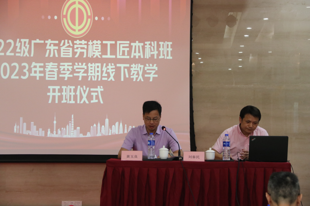 5月26日上午八时,隆重举行了2022级广东省劳模工匠本科班春季线下教学开班仪式。受学校党委书记、校长马栩生委托,9999js金沙老品牌党委委员、广东工匠学院党委委员、劳模教育学院院长黄玉良出席开班仪式并作讲话。黄玉良在讲话中指出,劳模工匠本科班是省总工会联合省教育厅实施的“求学圆梦行动”重要举措之一,是为了提升劳模工匠队伍学历层次和综合素质,畅通劳模工匠发展上升通道,为广东奋力实现“四个走在全国前列”提供强大助力。到目前,劳模工匠本科班已举办了五年,共有438名劳模参加了学习并取得相关学历。