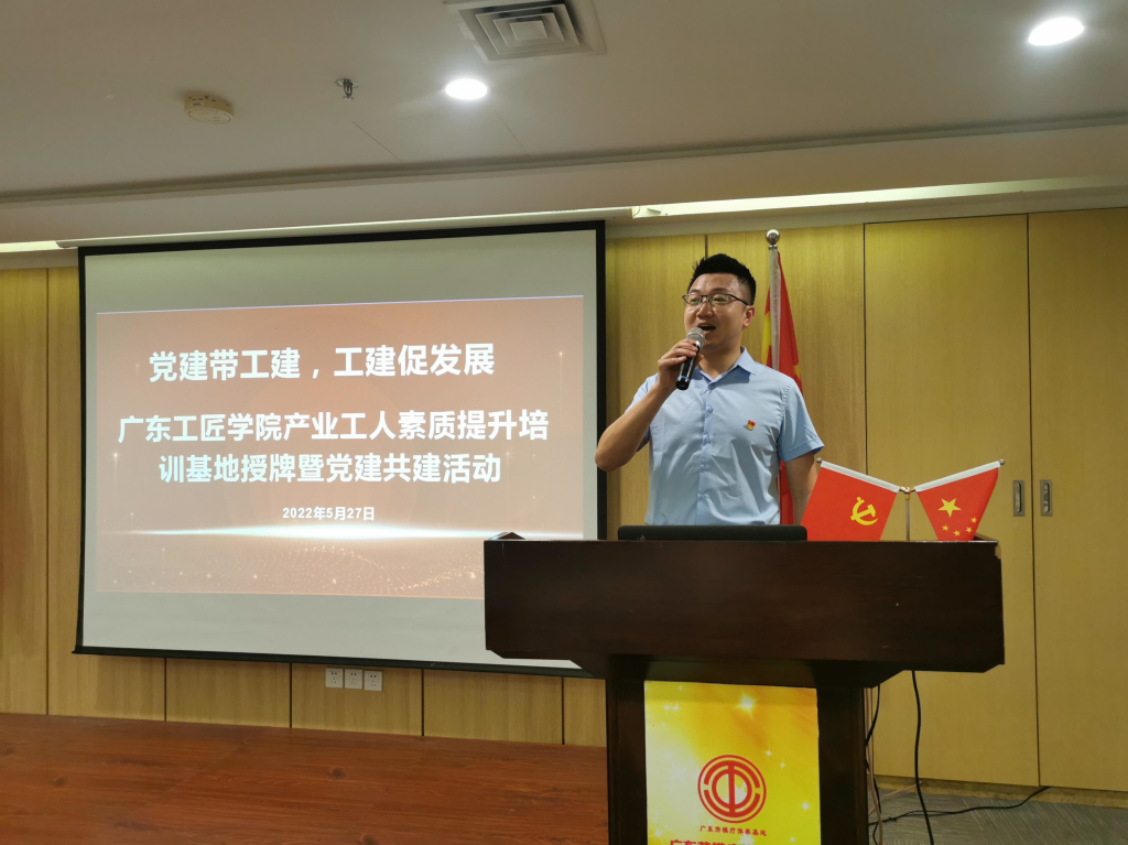 5月27日下午,广东工匠学院党支部与劳模基地党支部开展了以“党建带工建,工建促发展”为主题的广东工匠学院产业工人素质提升培训基地授牌暨党建共建活动。广东工匠学院执行副院长、支部书记黄玉良、广东劳模疗休养基地业主代表潘文光、基地总经理王东、支部书记及双方党支部党员、工作人员出席活动。