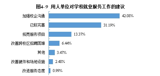 通过询问用人单位对本校就业服务工作的建议来了解学校就业服务工作需要改进和加强的方面,具体分布如下图所示:42.08%的受访用人单位反馈要加强校企沟通,31.19%的受访用人单位反馈学校就业服务工作已较完善。