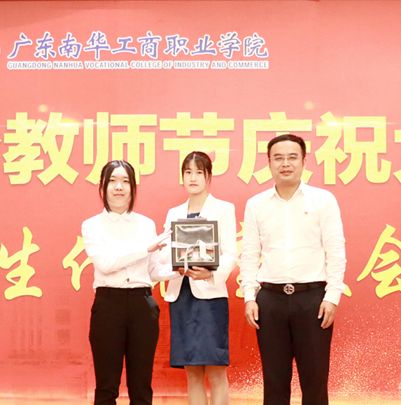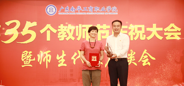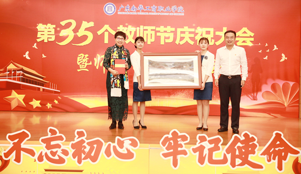 此次教师节大会,学校党委专为从教30周年以上的教师设立了“银龄奖”,高凤林、杨敏、马栩生为郭记中、谭红等11位获奖教师颁发证书,我校1996届国际贸易专业校友、广州齐裕塑料制品有限公司总经理刘经戌特意赶回学校,代表校友为“银龄奖”获得者赠送礼物,寓意鸿鹄(红壶谐音)之志,大有作为,寓意教师深耕教学30载,风雨兼程,播洒光与爱,传道授业,桃李满天下。会上,学校客座教授、法国巴黎艺术学院陶瓷学院院长操驰向学校赠送陶瓷版画“晨光”,寓意学校欣欣向荣。“成合窑”第三代传人、首届广东省工艺美术职工职业紫砂、朱泥壶创作技能大赛银奖获得者佘慕君向学校赠送代表作朱泥壶“五福临门”,第九届广东省大学生职业规划大赛高职组冠军李安琪代表学生向学校赠送多肉文创产品。