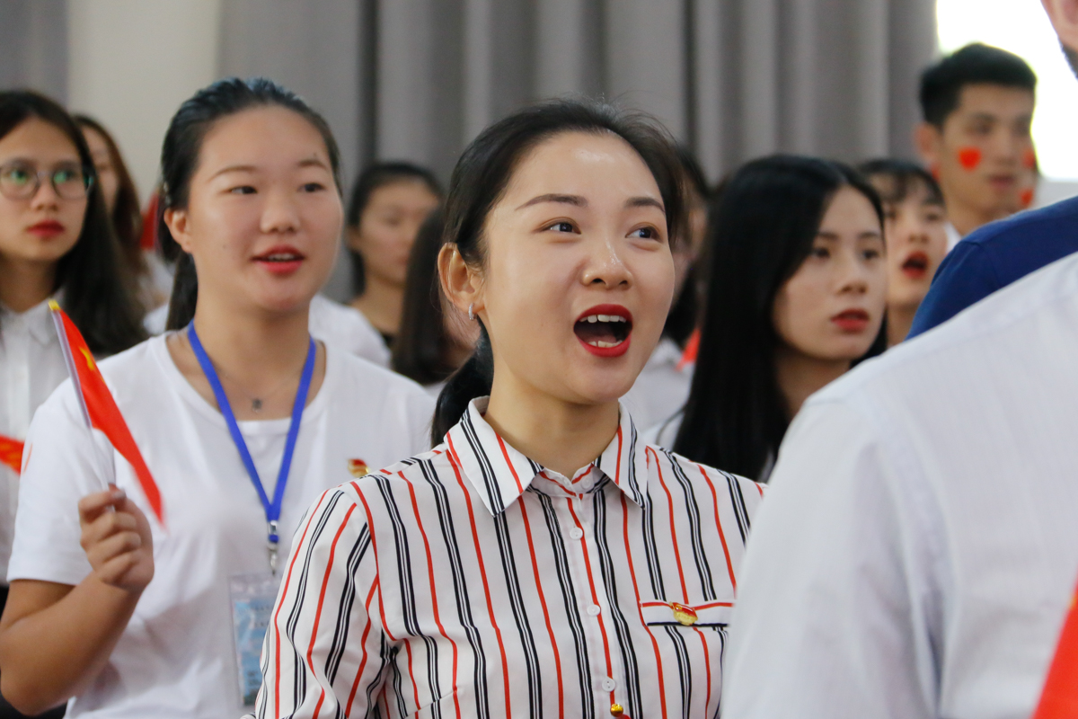 全体师生起立放声高唱《我和我的祖国》,挥动手中的国旗,用心中的歌,祝福我们的祖国更加繁荣富强!祝福我们的人民富裕安康!祝福我们的南华越办越好!