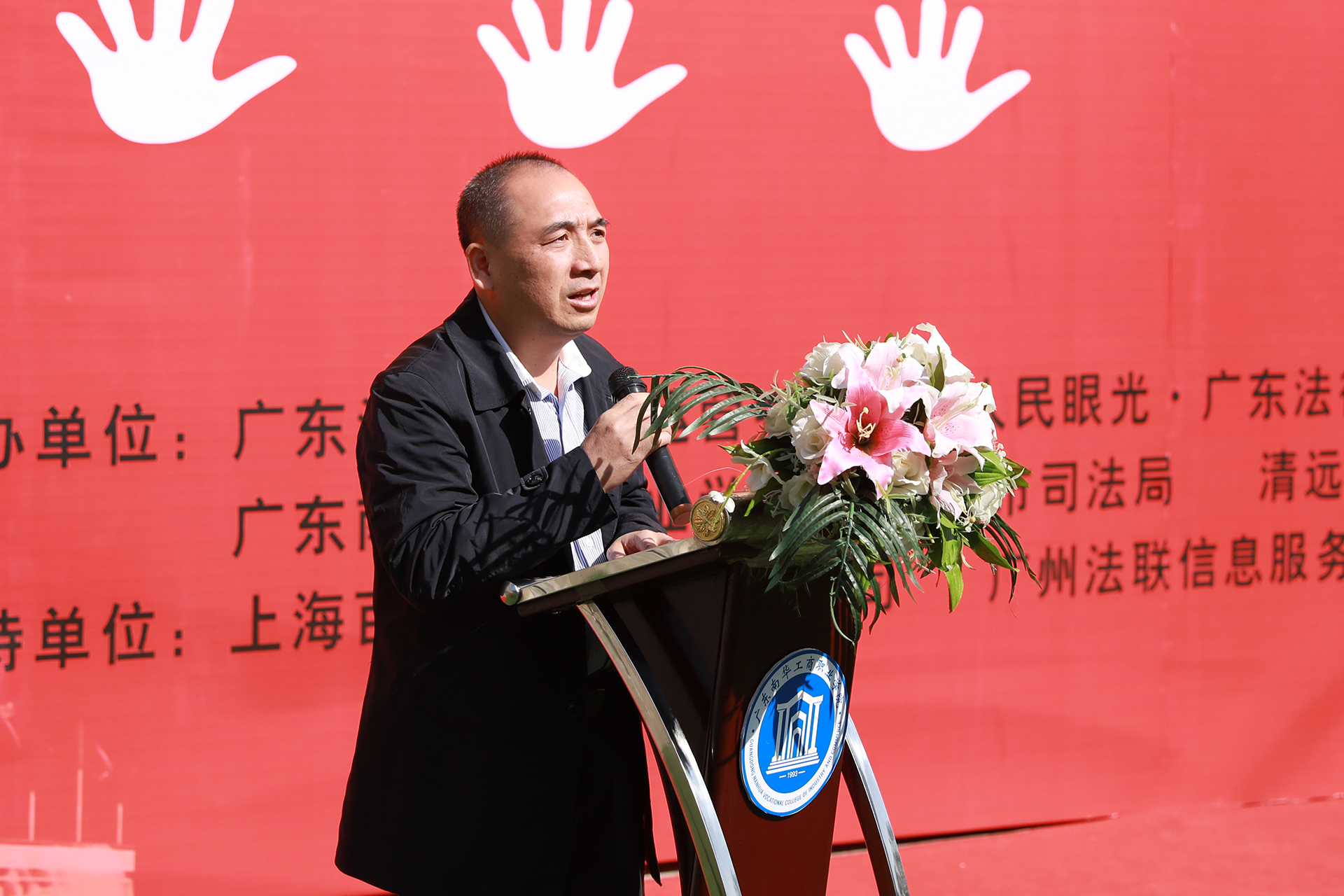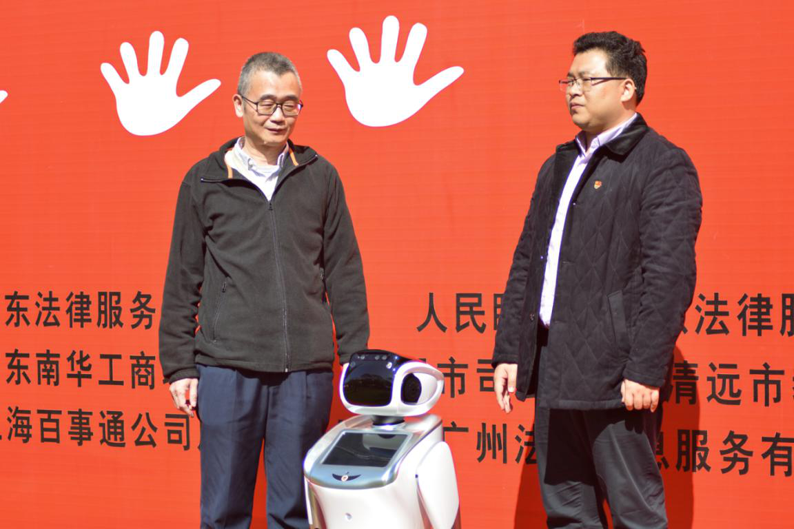 广东省司法厅公共法律服务处调研员涂俊杰、清远市教育局副局长贾圣广、中国广州仲裁委员会秘书部部长张小建、清远市律师协会会长邝庆刚、上海百事通公司广东分公司总经理叶珮枫与我校党委书记、校长马栩生、副校长王学真、纪委书记韦秀华出席启动仪式。我校纪委书记韦秀华、清远市教育局副局长贾圣广分别致辞和讲话。省司法厅公共法律服务处调研员涂俊杰与副校长王学真为我校智能普法机器人启用开机。