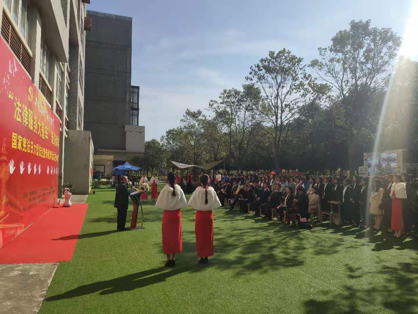 韦秀华指出,“法律服务大篷车”走进南华——国家宪法日大型法治宣传教育活动启动仪式,是我校“12.4”国家宪法日暨普法宣传月的重要活动之一。我们要以“普法宣传月”活动为载体,深入贯彻落实党的十九大和十九届二中、三中、四中全会精神,坚持以习近平新时代中国特色社会主义思想为指导,进一步加强我校师生的宪法法治教育,切实增强师生尊法学法守法用法意识,提高学校普法水平,努力形成依法治校环境,全面推进依法治校。韦秀华倡议,全体师生要认真学习宪法,提高宪法意识和法治观念,牢固树立忠于宪法、遵守宪法、维护宪法的自觉意识,让宪法信仰植根于我们每个人的内心深处,让宪法实践成为我们的自觉行动,争做践行社会主义核心价值观的楷模,为“法治中国”和“法治南华”梦想的实现砥砺前行、携手并进。