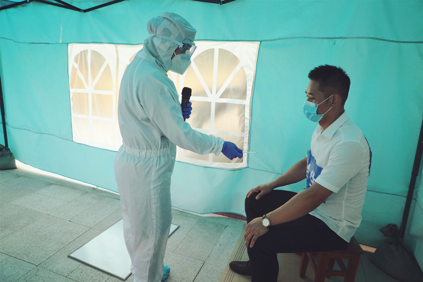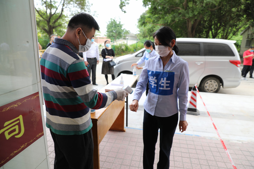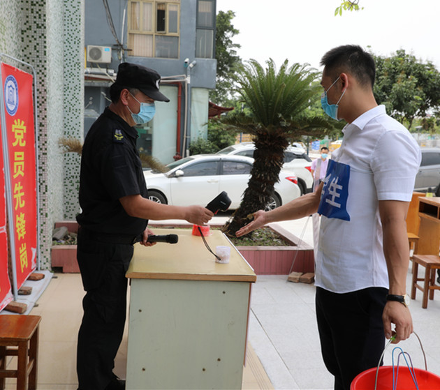 首次入校,安保人员确定其体温正常后,工作人员查验身份证、工作证、学生证后让其用免洗手液洗手消毒,并对随身行李消毒。