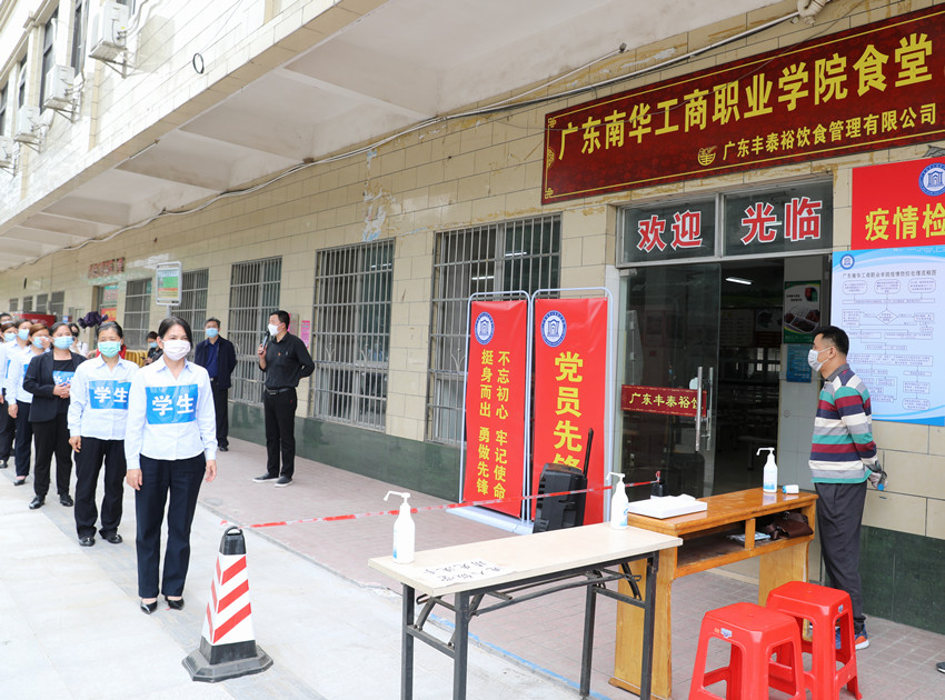 学生、教职工实行错时就餐、分散就餐。师生就餐时须佩戴口罩,进入食堂时需排队消毒洗手。