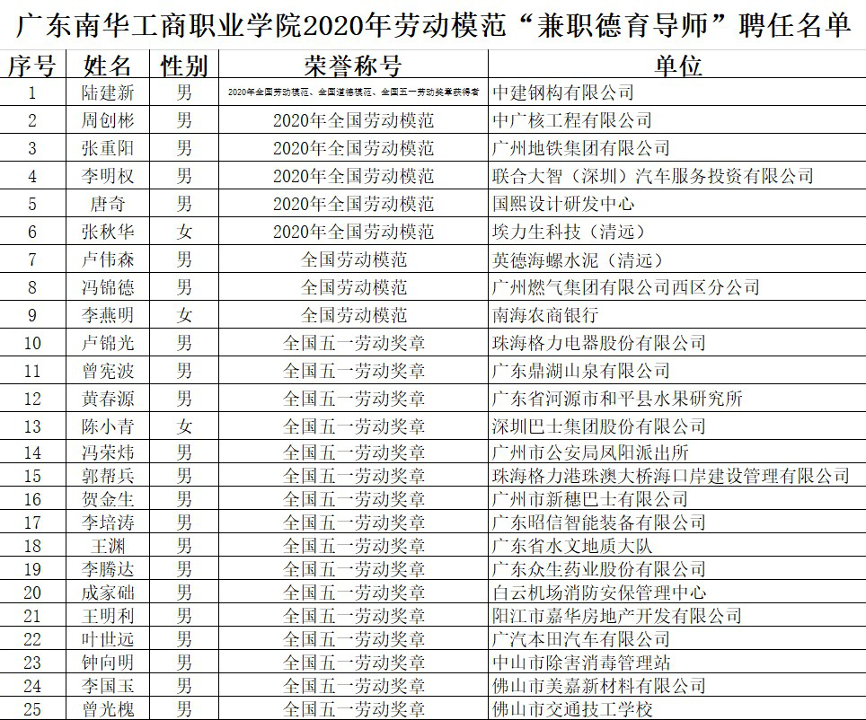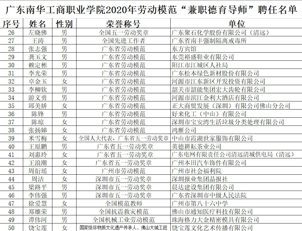 活动第二部分是集中聘任,陆建新、2020年全国劳动模范周创彬、张重阳、李明权、唐奇、张秋华,全国人大代表、广东省劳动模范米雪梅等50名国家、省、市劳动模范代表获聘“兼职德育导师”。此次我校举行劳动模范“兼职德育导师”集中聘任大会是国内高职院校首次大规模集中聘任劳动模范。为成功举办此次劳动模范“兼职德育导师”集中聘任大会,我校前期召开了多次筹备会、研讨会和劳模工匠座谈会,倾听全国、省级、市级劳动模范和全国先进工作者的意见和建议,对聘任人选和规章制度进行深入分析和研究,目前已出台了《9999js金沙老品牌关于聘请劳模代表担任德育兼职导师的实施方案》。