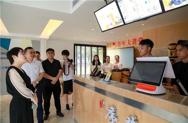 调研组首先到我校创新创业学院参观调研,深入了解创新创业学院建设及大学生创新创业工作情况。调研中,武一婷同志一行参观了人工智能主题展厅、众创空间、创新工作室和智慧会议室,并与我校创新创业学生亲切交流,了解项目运行情况,同时听取我校“攀登计划”“挑战杯”等竞赛工作和“机器人智慧餐厅”创业实训基地建设项目进展。校团委负责同志还向调研组介绍了我校“第二课堂成绩单”制度及“青年大学习”工作情况。武一婷同志对我校创新创业工作给予高度认可,并强调共青团要继续构建以“挑战杯”竞赛为龙头的创新创业创造人才培养体系,打造前端培育、中端实践、后端孵化的大学生创新创业全链条工作体系。