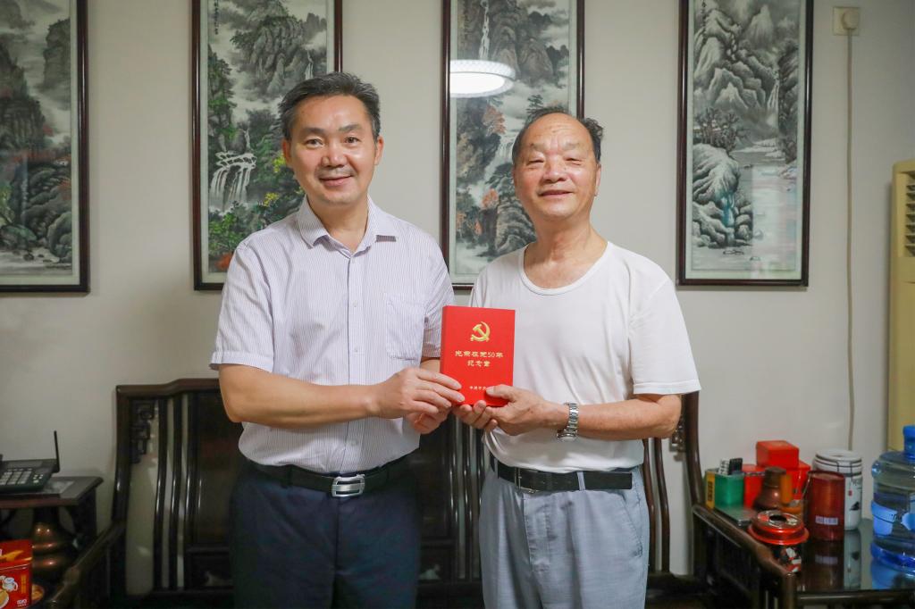 6月22日,学校党委书记、校长马栩生和党委委员、副校长严新上门走访慰问原广东省总工会干部学校校长李培新并颁发“光荣在党50年”纪念章,将党的关怀温暖送进老党员家中、送到老党员心中。