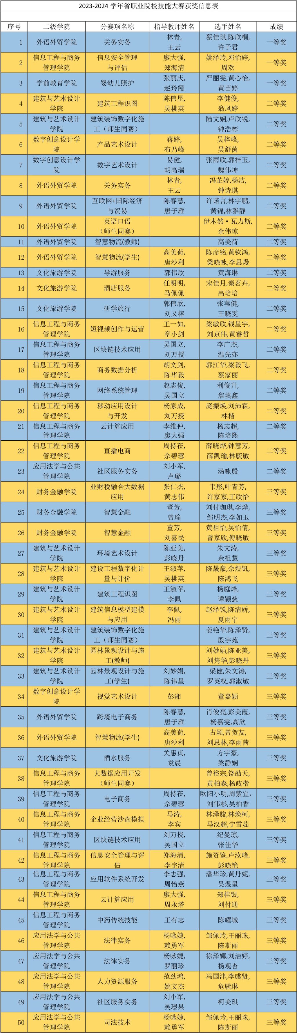 我校共有50支队伍参赛,信息工程与商务管理学院的信息安全管理与评估赛项以全省第2名荣获一等奖,学前教育学院婴幼儿照护赛项以全省第2名荣获一等奖,外语外贸学院的关务实务赛项以全省第8名获得一等奖。