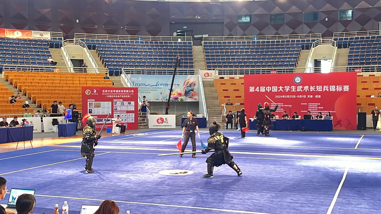 第四届中国大学生武术长短兵锦标赛由中国学生体育联合会主办,中国学生体育联合会大学武术分会执行,天津市武术协会、天津市武清区体育局、天津市武清区武术协会承办,来自北京大学、中山大学、华南理工大学、华南师范大学、北京体育大学等百余所高校的1000余名运动员展开角逐,是迄今为止全国规模最大的武术长短兵竞赛活动。财务金融学院2023级蔡梓晴、汪洋代表学校初登国赛,在激烈的角逐中迎难而上、奋勇拼搏,取得优异成绩,实现了我校在全国大学生武术赛事中的历史性突破。