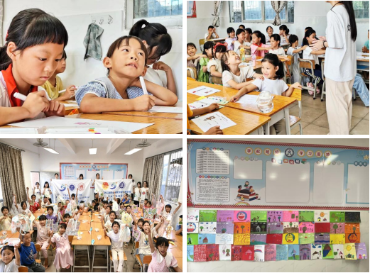 工作之余,我也会协助教学组的队员参与教学活动。清晰记得第一次课见面会时,有几个小朋友迟迟不愿动笔作画,坐在角落的小朋友对我说:“老师,我不会画画,也不会画衣服。”那一刻,我心酸不已,难过自己无法从根本上改变乡村教育资源稀缺的现状。而我所能做的,便是在这有限的时间里尽可能地陪伴他们。令我惊喜的是,经过支教小朋友们逐渐发生变化,每一次课的手工作品都有自己的独特风格,乡村的小朋友们或许缺乏教育资源,内心世界却丰富多彩。倘若能给予他们一个展示自我的平台,他们的表现定会更加精彩。