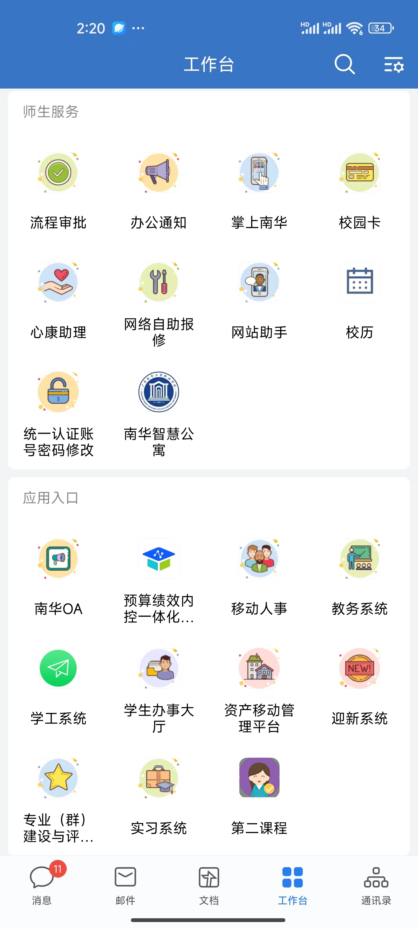 学校企业微信用户为实名用户,所有用户均由学校在数据中心统一录入,用户收到邀请信息后经确认后便可使用,非学校指定用户不能加入。加入后,登录工作台,若页面如下(每人权限不同,界面不同),则加入成功。