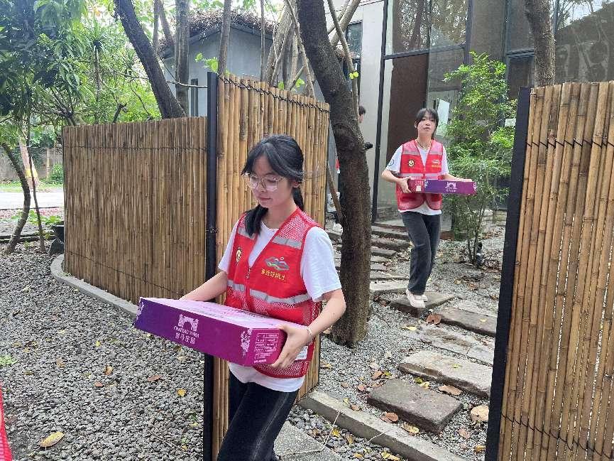 在陈晓懿劳模的带领下,同学们一起积极投入劳作,从会场礼仪、签到引导到配合企业拍摄宣传片到物资搬运、农产品包装及摆放等劳动实践环节,同学们以具体劳动切身体验了清远好风土品牌的宣传推广及其他各项工艺流程,为大湾区清远鸡产业注入新活力。