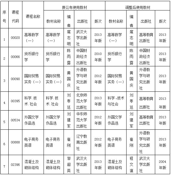 根据全国高等教育自学考试指导委员会办公室《关于2013年高等教育自学考试新版大纲和教材信息变更及教材使用调整的通知》(考委办函[2013]19号)的规定,调整2013年10月我省高等教育自学考试部分课程使用教材,《混凝土及砌体结构》(课程代码:02396)课程仍使用2004年版的大纲和教材,具体课程使用教材调整情况见附件。请你们及时将有关课程使用教材调整的规定向考生公布。