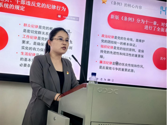 周敏围绕《条例》历次修订情况、新版《条例》的核心内容、重要意义等方面进行深入解读和探讨,她指出,全体党员要坚持以新时代中国特色社会主义思想为指导,全面贯彻党的二十大精神,深刻领悟“两个确立”的决定性意义、坚决做到“两个维护”,进一步严明党的政治纪律和政治规矩,带动各项纪律全面从严。她号召同学们在未来的工作和学习中,要加强对《条例》的学习与宣传,深刻认识遵守党的纪律的重要性和必要性、违反党的纪律行为的严肃性,要注重发挥《条例》在全面从严治党中的基础性作用,增强纪律意识和规矩意识,明确纪律遵循和行为准则。