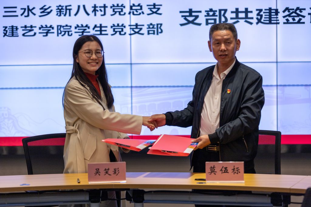 会上,建筑与艺术设计学院党总支副书记胡娟致欢迎辞;教师党支部组织委员杨思维汇报了筑梦者突击队的调研结果,详细介绍了和平街区的改造设计方案;学生党支部组织委员吴笑影汇报了擎苍突击队的调研报告,介绍了三套新八村口景致改造设计方案和十六套新八村茶叶品牌形象包装设计方案。为深入开展助力乡村振兴项目,建艺学院教师党支部、学生党支部分别与浛洸镇党委直属第二党支部、新八村党总支部签订支部结对共建协议,持续开展设计赋能乡村振兴项目。