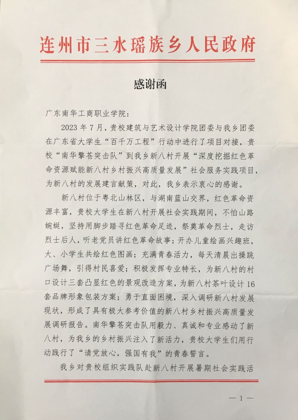 连州市三水瑶族乡党委副书记康海燕对“南华擎苍突击队”到新八村开展“深度挖掘红色革命资源赋能新八村乡村振兴高质量发展”社会服务实践项目,为新八村的发展建言献策,表示感谢;认为村口改造方案和茶叶包装设计方案突显了新八村的红色元素,希望建艺学院继续组织大学生到三水瑶族乡开展社会服务实践项目,一起为乡村振兴奉献力量。