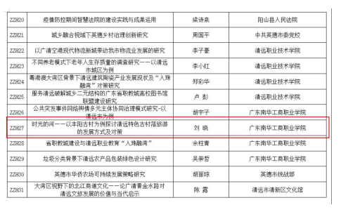 2020年3月,环境艺术设计专业专任教师刘晓的科研课题“时光的河--以丰阳古村为例探讨清远古村落旅游的发展方式及对策”与刘隽华老师的“广清一体化”—基于“非遗”木雕技艺应用与开发创新研究”批准为清远市哲学社会科学专项研究项目。这是环艺、建装、风景园林专业教师在非遗研究方面取得的一重大突破。