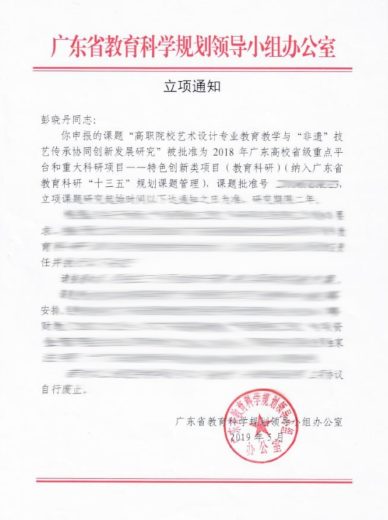 2019年5月,艺术设计系主任、环境艺术设计专业专任教师彭晓丹的科研课题“高职院校艺术设计专业教育教学与‘非遗’技艺传承协同创新发展研究”批准为 2018 年广东高校省级重点平台和重大科研项目——特色创新类项目(教育科研)(纳入广东省教育科研“十三五”规划课题管理)。由此,环艺、建装、风景园林专业在非遗研究方面取得了重大突破,为传统手工艺的研究奠定了理论基础,更为后期“非遗”创新教学指明了方向。