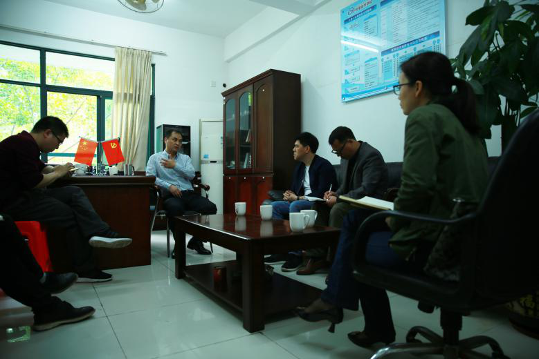 图一 广东轻工职业技术学院机电技术学院院长贺爱东为我方调研人员介绍产业学院建设经验并解答