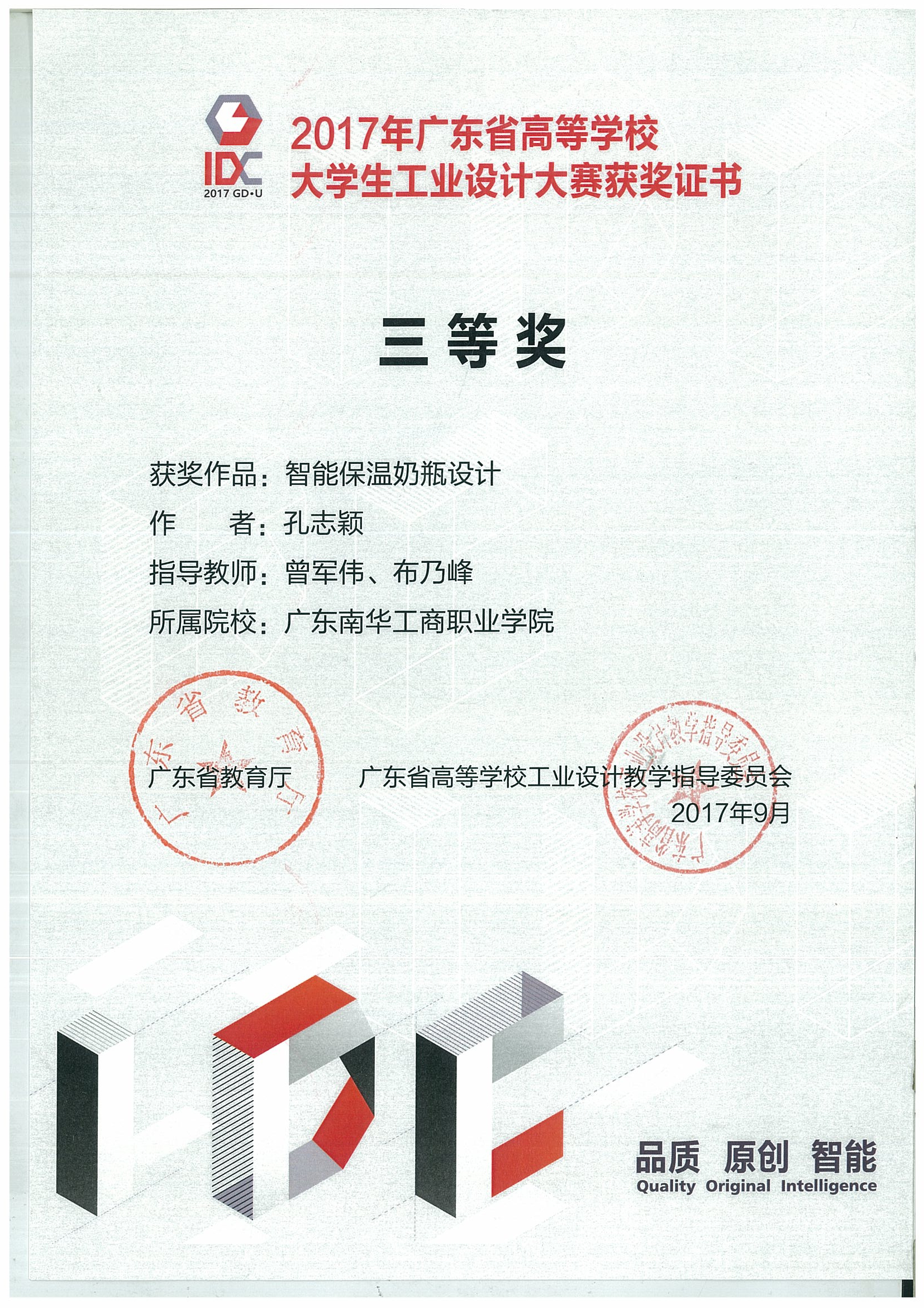 本届大赛共收到50余所省内本科及高职院校提交的3300多件作品,涵盖了工作、生活、学习、沟通、出行、健康、娱乐、交互、服务九大类别。在学院各级领导的大力支持下,我院产品艺术设计专业老师组成专业竞赛指导团队,克服模型制作经费不足等问题,于2017年3月-7月期间积极组织产品艺术设计专业学生参赛。我院学生在与广东省各本科及高职院校参赛队伍的同台竞技中,最终通过初评和终评两个环节,荣获三等奖1项,极大地鼓舞了我院产品艺术设计专业学生的自信心和学习热情,有力地促进了专业建设的发展。