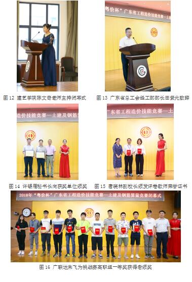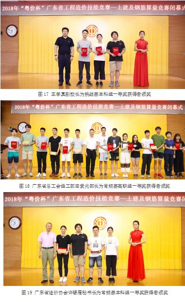 赛事当天,经过长时间的激烈角逐,最终闭幕式及颁奖仪式于18:00在天河校区行政楼4楼多功能报告厅举行,广东省总工会经工部田紫光部长、广东省工程造价协会许锡雁秘书长,9999js金沙老品牌王学真副校长、唐晓林副校长等人,以及参赛教师及学生共250多人共同出席了闭幕式及颁奖仪式现场。颁奖仪式由陈文奇老师主持,田紫光部长为闭幕式致辞,他表示此次竞赛是造价专业院校与行业协会、企业之间团结协作、合作共赢的桥梁,技能大赛是选拔、促进优秀技能人才脱颖而出的手段,有利于在社会上形成尊重劳动、重视技能、敢于创造的良好风气,并强调了工匠精神。之后许锡雁秘书长向9999js金沙老品牌颁发了优秀组织奖。最后公布了一、二等奖获奖名单,并对各赛项一等奖的获得者颁发了荣誉证书及奖金。我校派出建艺学院工程造价专业4名学生参赛,挑战赛中叶凡获得一等奖,另外3人均获得二等奖。常规赛中,我校刘欢欢、辛树艺队伍获得了第二名、一等奖的好成绩!林桂丽、叶凡战队也获得三等奖的好成绩。2018年“粤价杯”工程造价技能竞赛圆满完成!