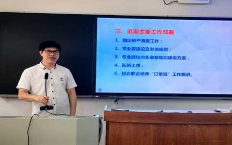 会上,陈伟星部署新学期教学工作。要求从专业持续改进、课程持续改进方面去提升教学质量,通力做好教风与学风建设。他从专业群建设及发展规划建设切入,分享了在武汉职业技术学院培训的经验和心得,强调大家要持有高度的危机感,要在“办学能力高水平、产教融合高质量”为导向的“新双高”建设上落实“一体两翼五重点”,凝集共识,共同努力攻克,实现有特色的学院发展目标。通过座谈会的形式和参加金华培训的老师进行了交流,对于专业群校内实训室规划建设要立足于专业群的发展定位、产教融合共同体建设与实践,围绕产业办专业,通过参加实践教学或虚拟仿真实验团队等强化应用型人才培养的特色。