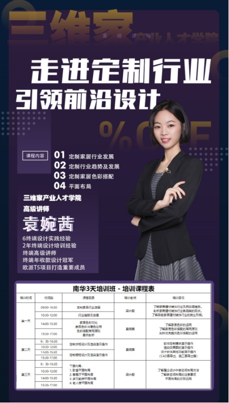 现任职三维家产业人才学院高级培训讲师,5年终端销售设计实战经验,历任维意定制设计店长、欧派集团家居培训部设计专业讲师,2年终端实战教学培训经历,培训场次达200+,足迹遍布中国60多个大小城市,培训落地且实操性强。