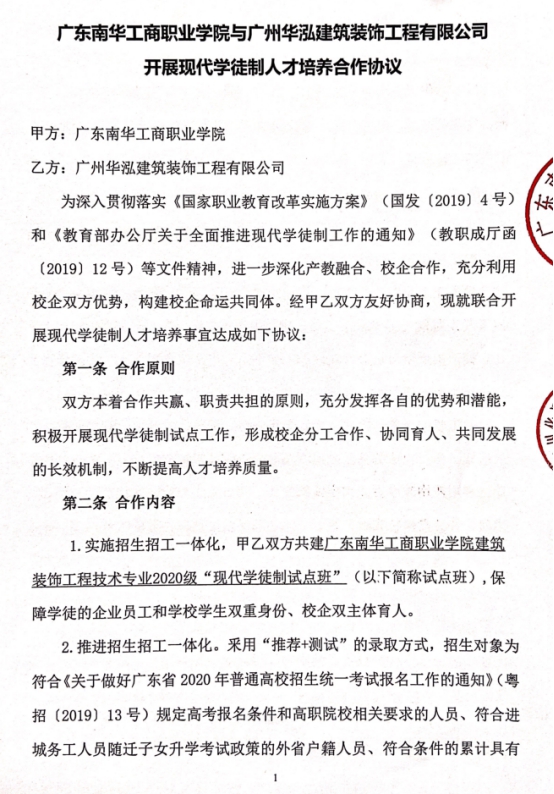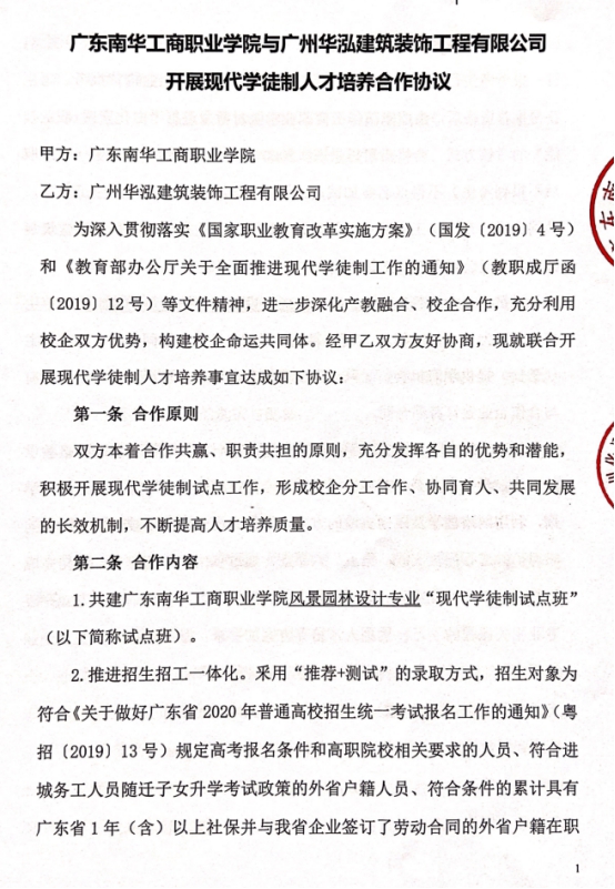 贯彻落实全国职业教育工作会议精神和《国务院关于加快发展现代职业教育的决定》,切实做好现代学徒制试点工作,探索建立校企产学研合作、协同育人的长效机制,建筑装饰工程技术、风景园林设计专业广州华泓建筑装饰工程有限公司签署合作协议申报2020年广东省高职教育现代学徒制试点,共同建设大学生校外实践教学基地,由公司专家和学校专业教师共同开发以真实工作项目为载体,按照工作过程组织教学的实践教学体系,实现企业与学校良性互动的长效合作机制。