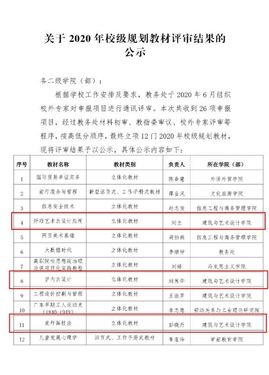 2020年6月,经过校外专家评审,建装、环艺专业教师校级规划教材3本获得立项。其中包含环境艺术设计专业刘隽华老师的《室内云设计》校级规划教材;环境艺术设计专业彭晓丹老师的《麦秆画技法》校级规划教材;服装与服饰专业刘立老师的《纤维艺术云设计应用》校级规划教材(服务建筑、环艺、风景园林的软装设计课程);特此祝贺。