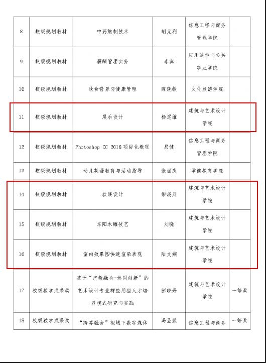 经过校外专家评审,建装、环艺专业教师校级规划教材 4本,精品在线课程 1 门获得立项。其中包含环境艺术设计专业刘晓老师的《东阳木雕技艺》校级精品在线开放课程;建筑装饰工程技术专业杨思维老师的《展示设计》校级规划教材;环境艺术设计专业彭晓丹老师的《软装设计》校级规划教材;建筑装饰工程技术专业陆文娴老师的《室内效果图快速渲染表现》校级规划教材,特此祝贺。